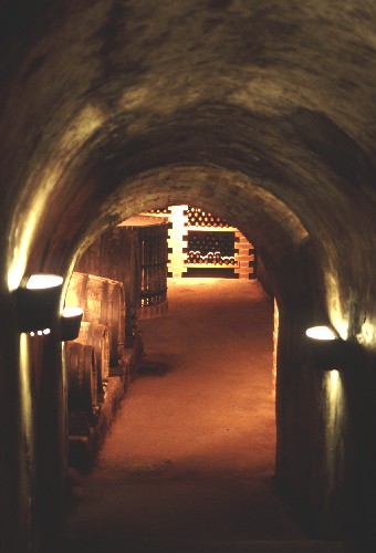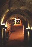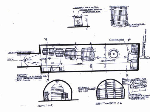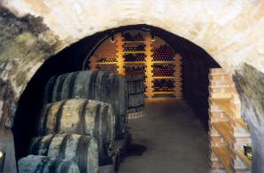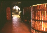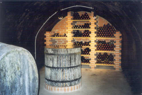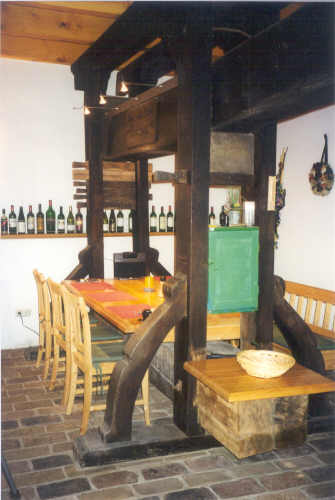 Der mit dem Pressraum verbundene Weinkeller wird als Degustierbereich verwendet, ein altes Pressfass wurde als Degustiertisch adaptiert.