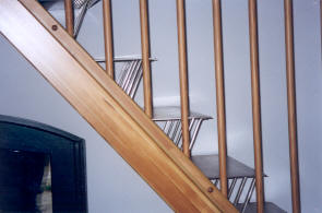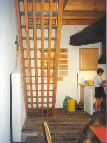 Die Lichtführung in dem ehemals dunklen Raum erfolgt von der Schlafzone im ehemaligen Heuboden über die transparent gestaltete Verbindungsstiege.