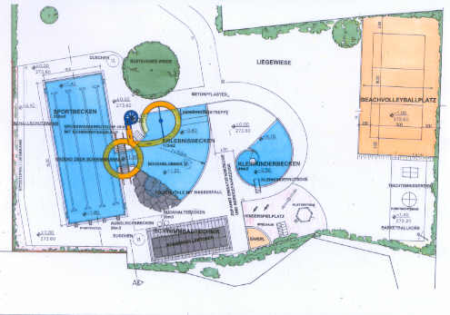 Die drei Bereiche des Schwimmbeckens sind durch gemeinsame befestigte Flächen verbunden, seitlich des Sportbeckens ist eine befestigte Liegefläche mit Sitzstufen (Zuschauer) vorgesehen.