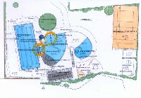 Im westlichen Freibereich sind die Sportbereiche untergebracht (Volleyball, Tischtennis, Rundtischtennis und evtl. Basketballkorb).