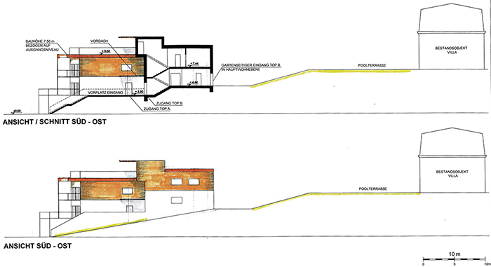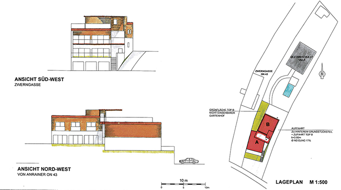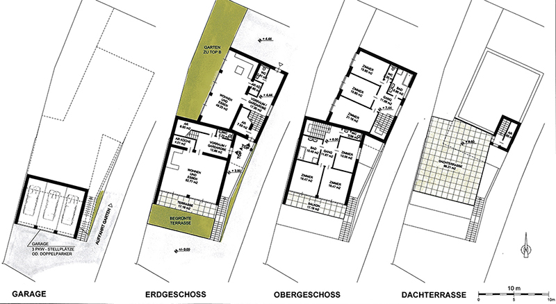 Das Dach dient teilweise als niveaugleiche Terrasse in der Hauptnutzungsebene des dahinter angeordneten Gebäudes Top A. Das dahinter und dem Hang folgend ca. ein halbes Geschoß höher angeordnete Gebäude Top B wird versetzt angeordnet, somit entsteht ein uneinsehbarer nach Westen orientierter Eigengarten an der linken Grundstücksgrenze.