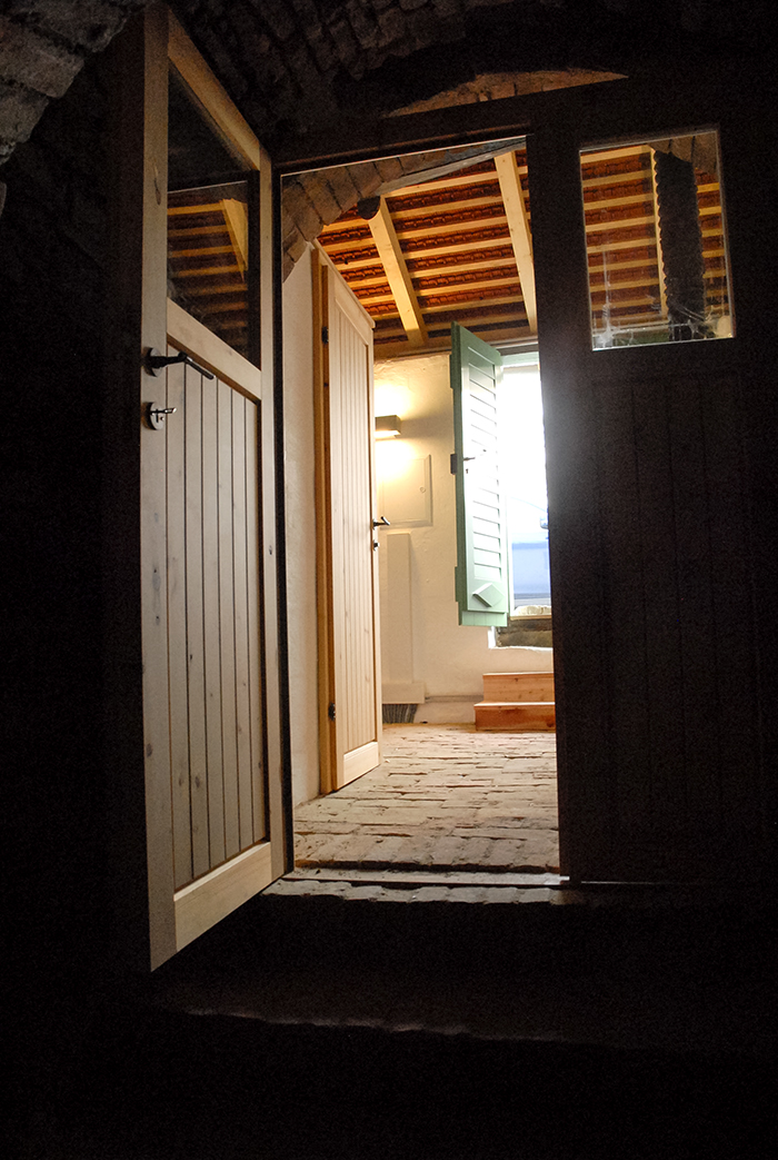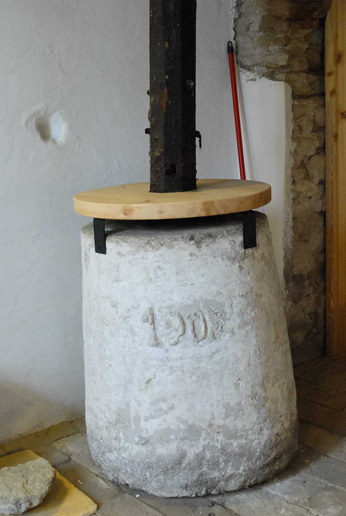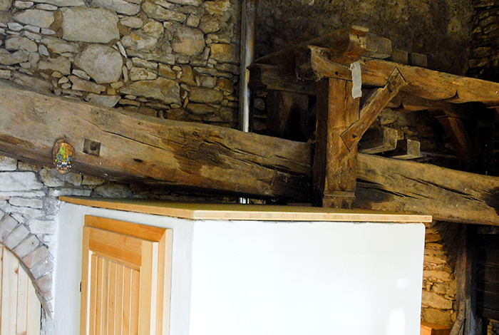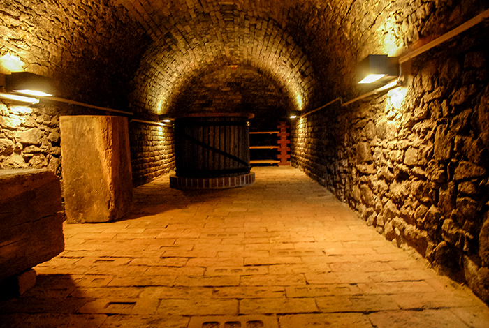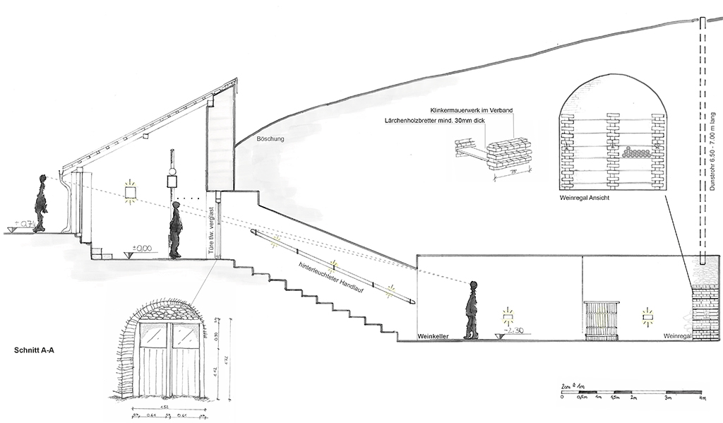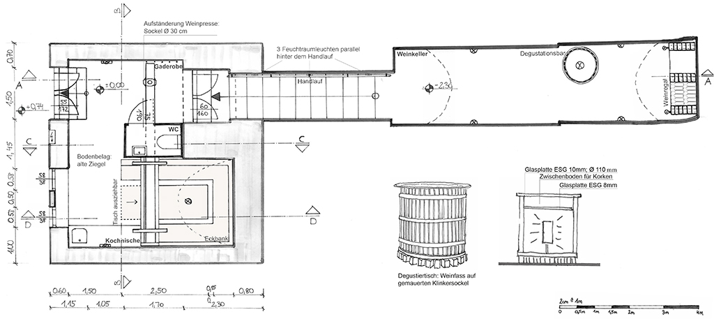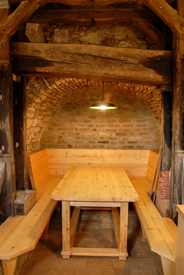 Im Presshaus wurde eine WC-Zelle installiert. Unter dem Pressbalken in einem Gewölbe befindet sich nun eine erweiterbare Sitz- und Essgelegenheit an die eine Kochnische anschließt.