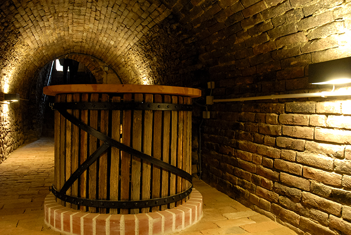 Der Weinkeller schafft mittels indirekter Seitenbeleuchtung und einem Degustationstisch aus dem ehemaligen Pressfass eine angenehme Atmosphäre.