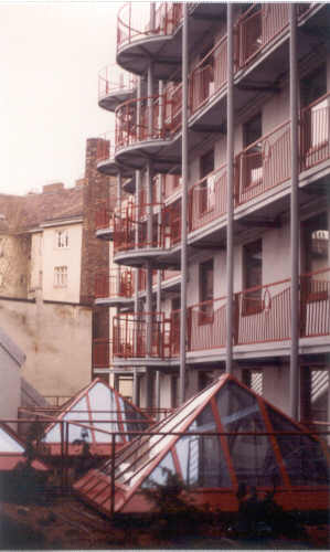 Die Gliederung der Fassade mit Putzflächen und zurückspringenden hinterlüfteten Metallfassaden, die halbrunden Stiegenhäuser, die die Knotenpunkte des schiefwinkeligen Grundrisses darstellen, sowie farbliche Kontrastierung und bewusst moderne Gestaltung soll einen städtebaulichen Impuls im umliegenden Viertel geben.